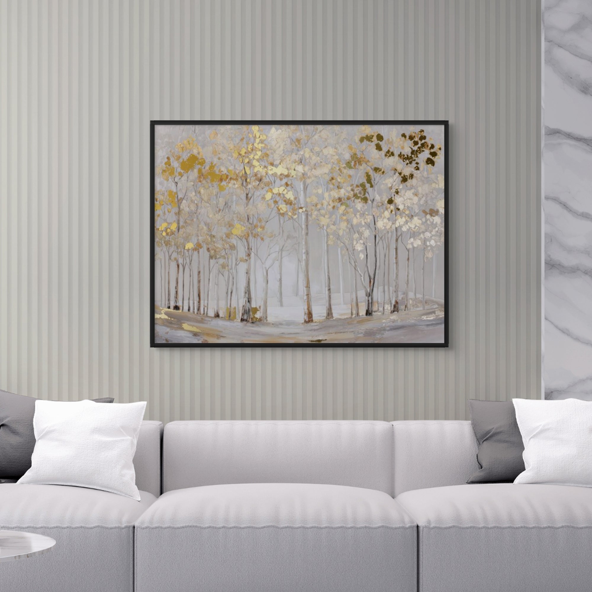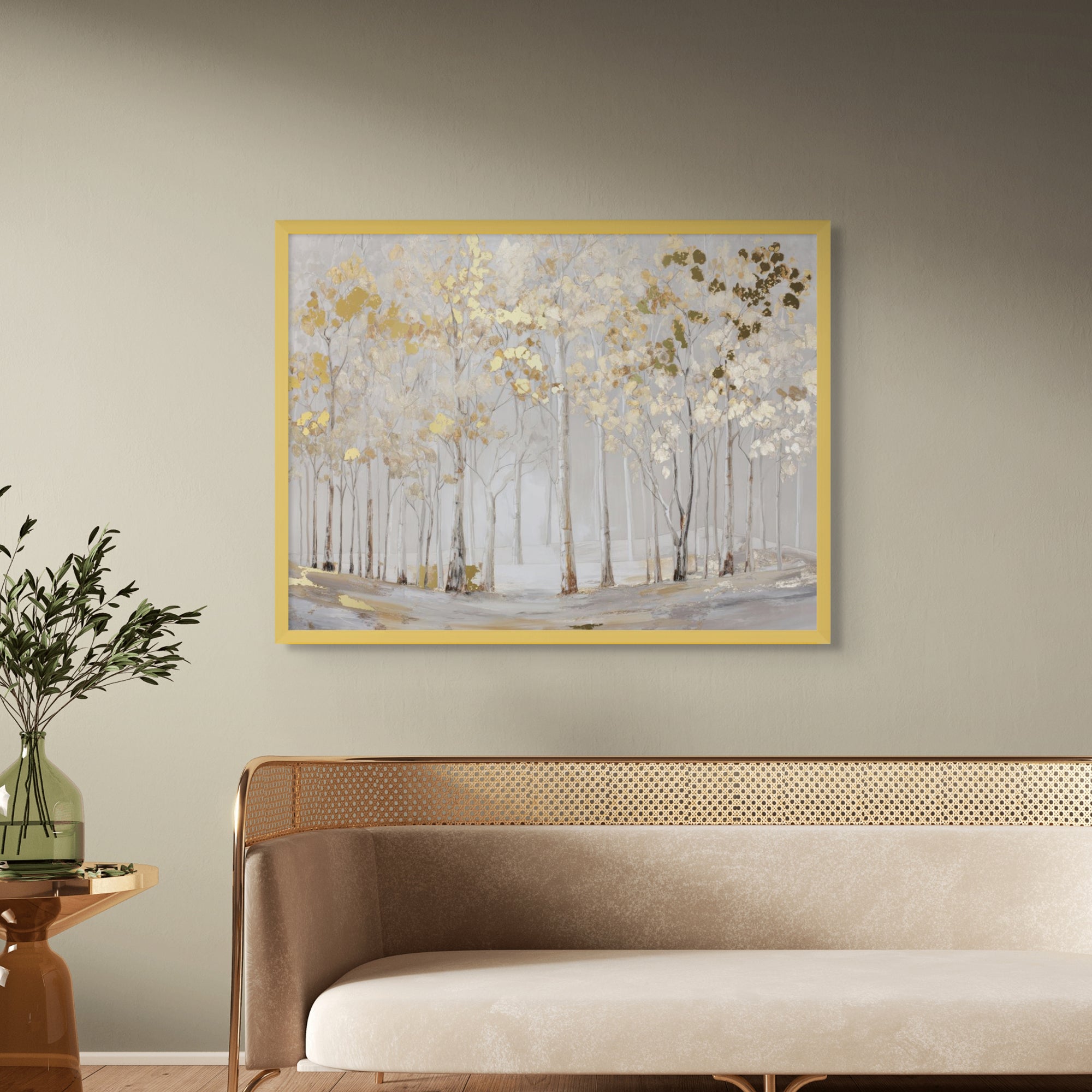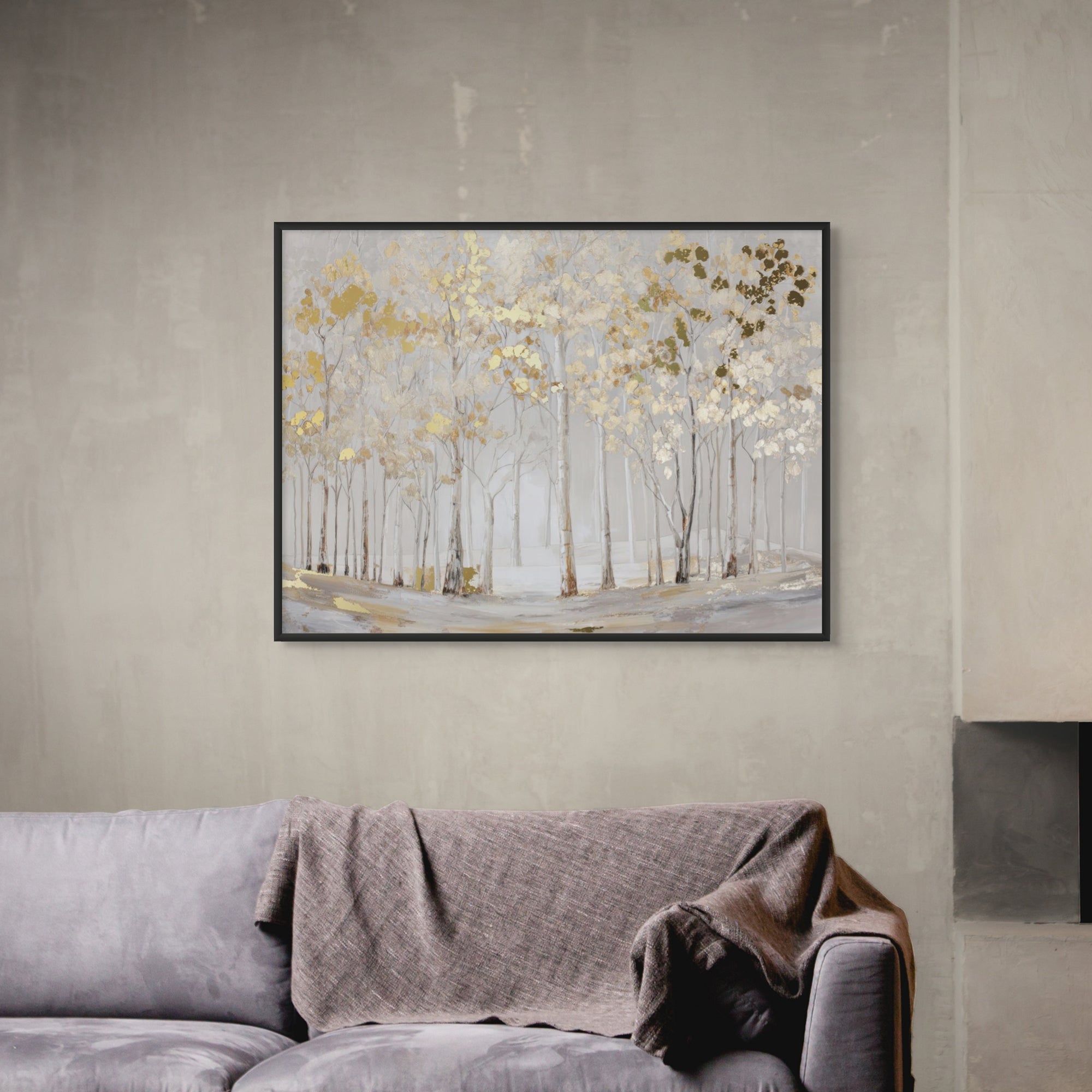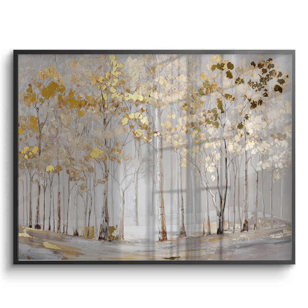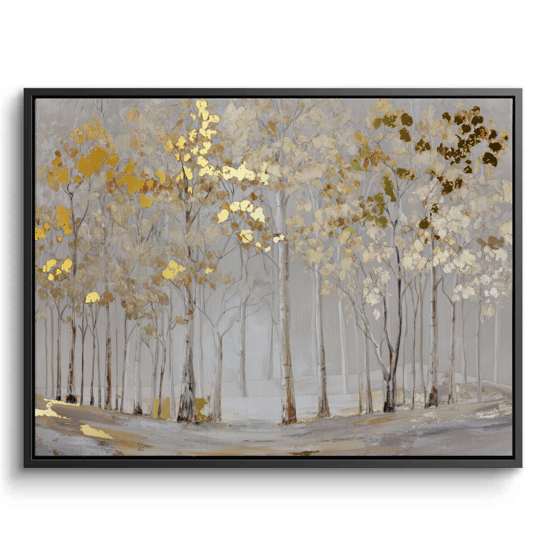 Elderlight Grove captures a serene stand of pale trees bathed in soft winter light, where delicate gold accents glimmer through a misted landscape. The artwork brings an airy sense of calm and quiet elegance, making it ideal for bright living rooms, tranquil bedrooms, and refined hallway spaces.