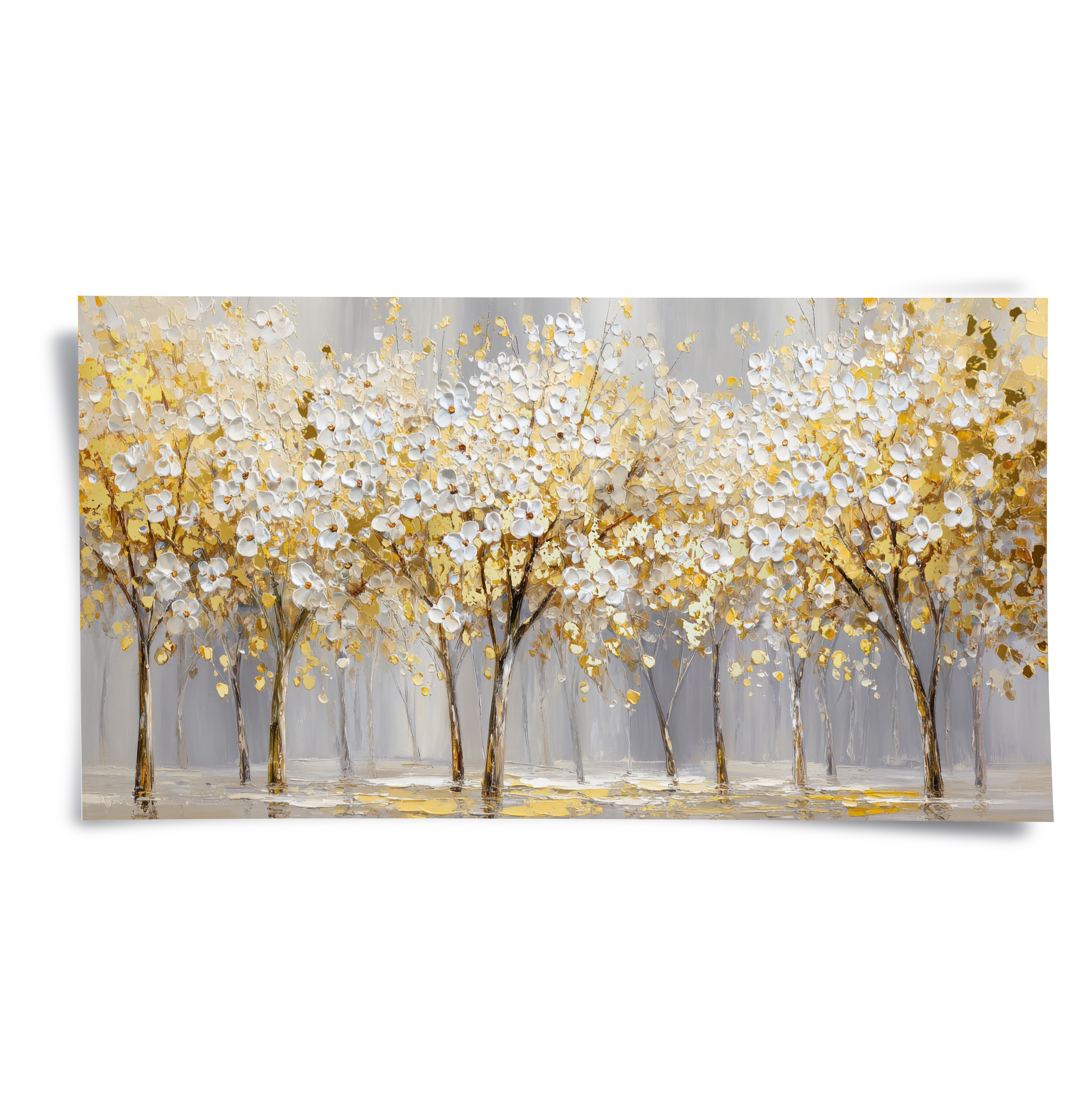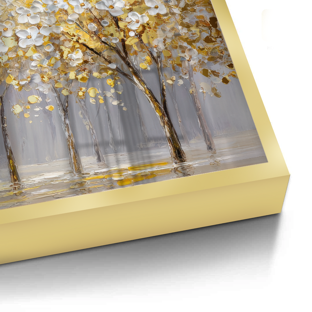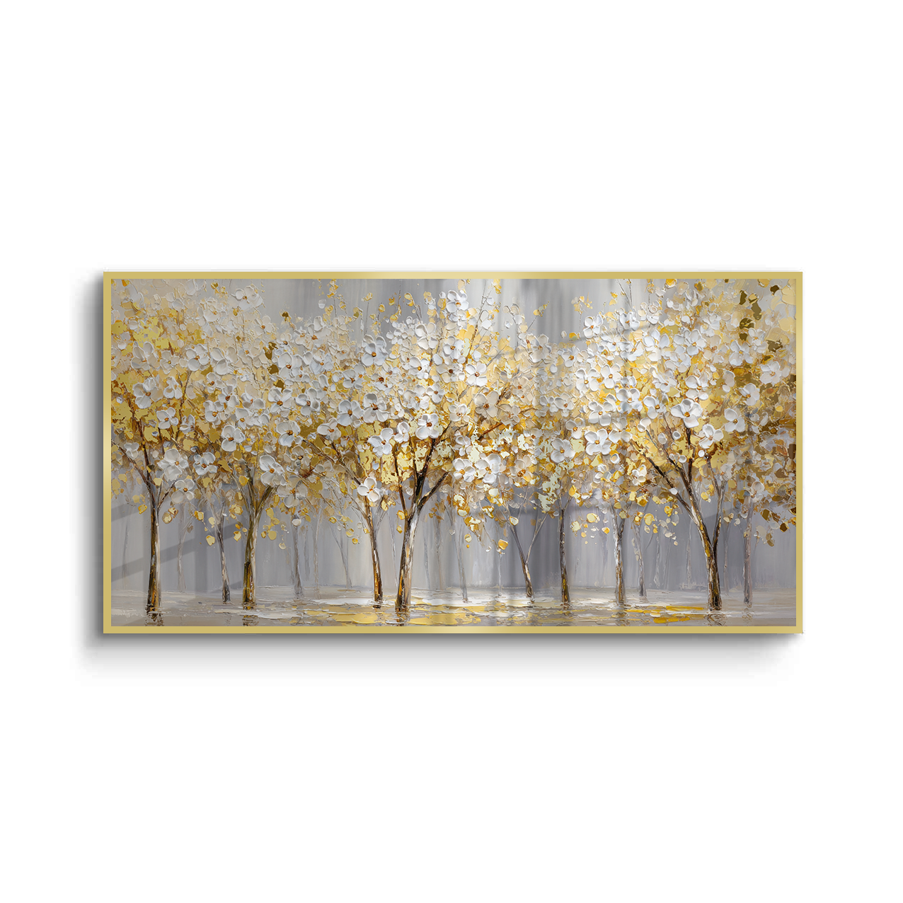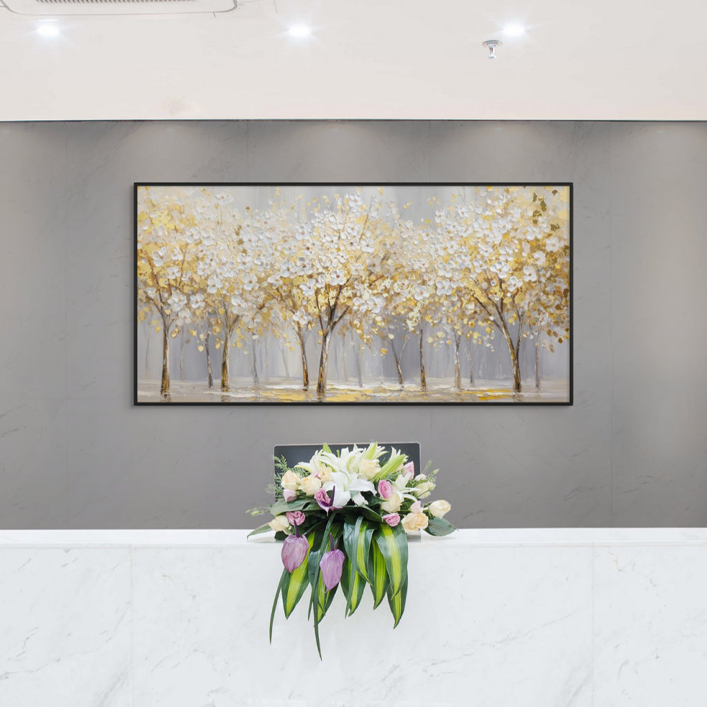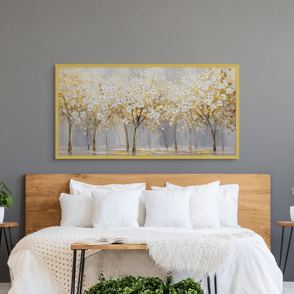 Gilded Bloomscape unfolds a panoramic stretch of white blossoms illuminated with rich gold accents, creating a luminous rhythm across the landscape. Soft neutral tones ground the composition, allowing the artwork to bring warmth and refined elegance to living rooms, dining spaces, and expansive feature walls.