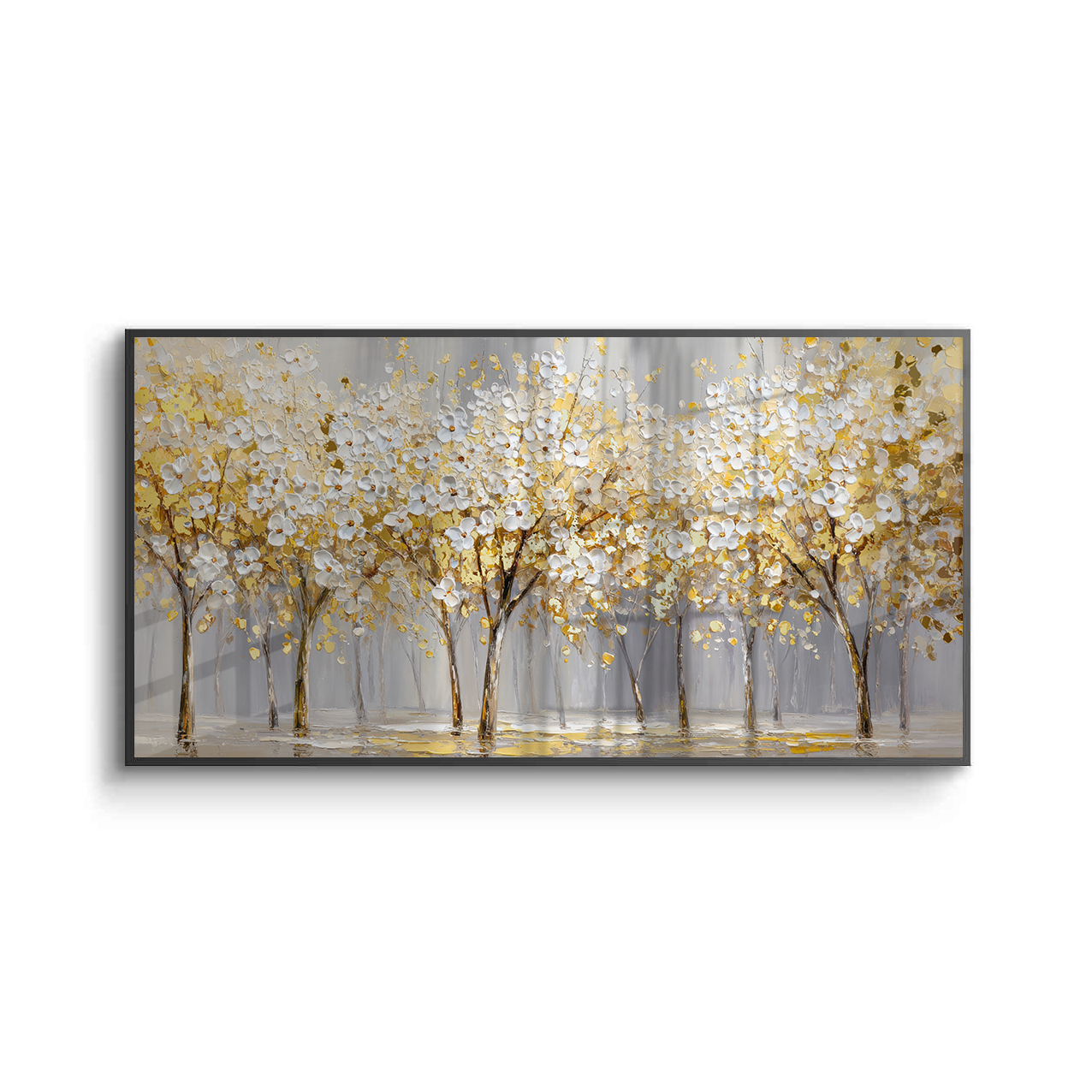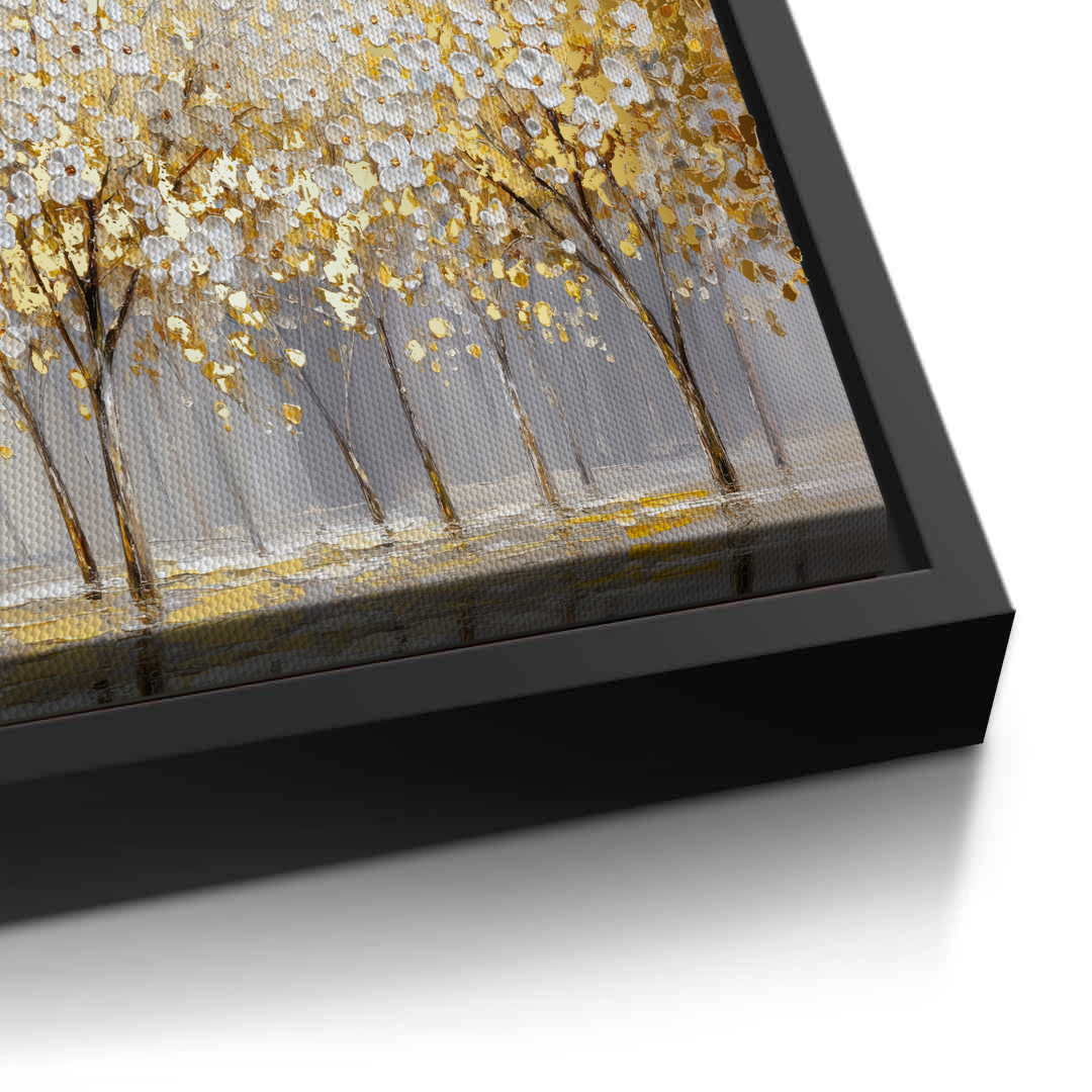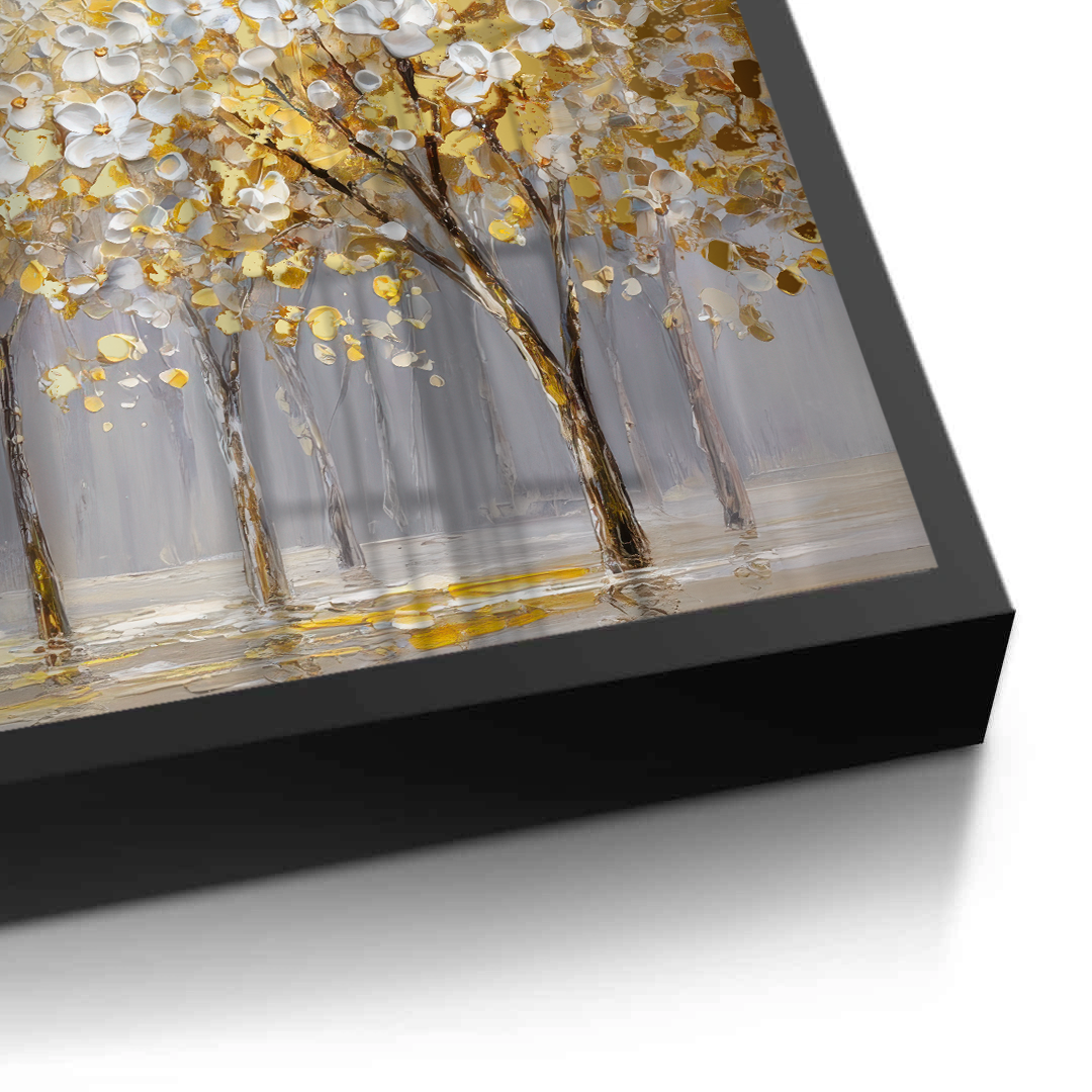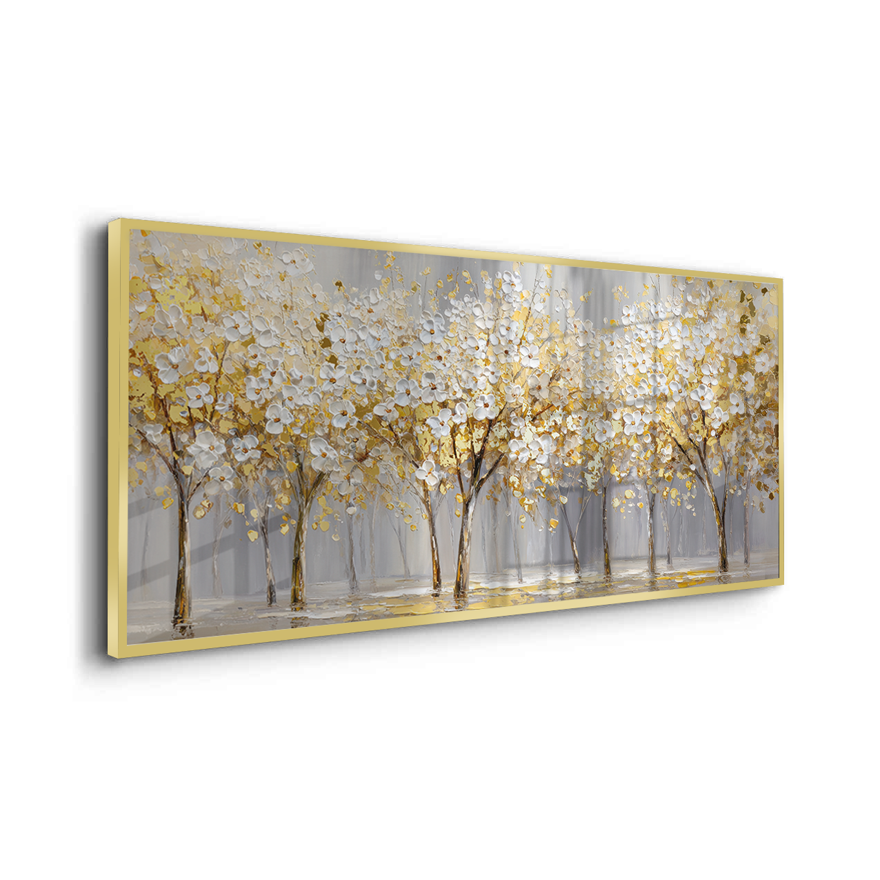 Gilded Bloomscape unfolds a panoramic stretch of white blossoms illuminated with rich gold accents, creating a luminous rhythm across the landscape. Soft neutral tones ground the composition, allowing the artwork to bring warmth and refined elegance to living rooms, dining spaces, and expansive feature walls.