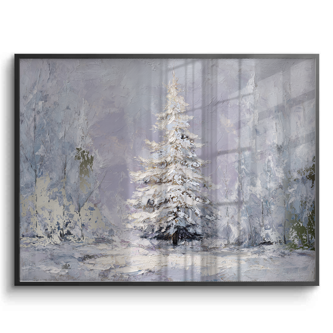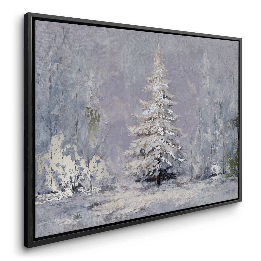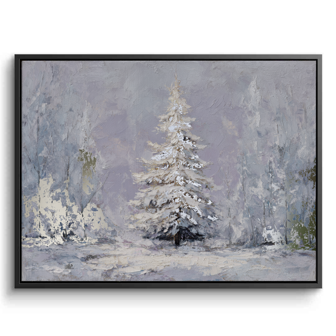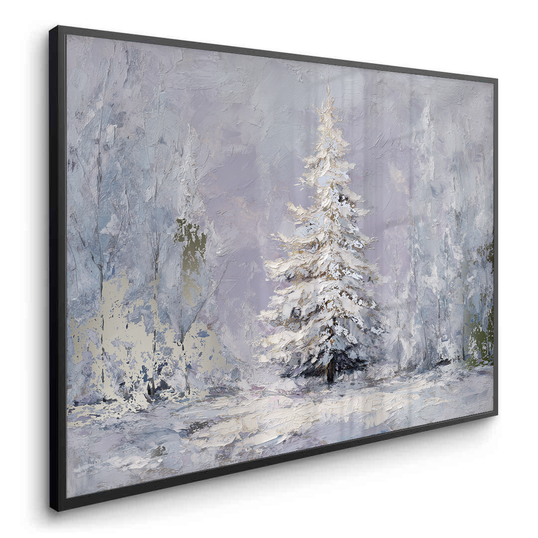 The Last Pine portrays a solitary evergreen standing in quiet snowfall, its snow-laden branches softened by pale winter light and muted tones. The artwork evokes solitude and calm, making it ideal for serene living rooms, peaceful bedrooms, and contemplative hallway or reading spaces.
