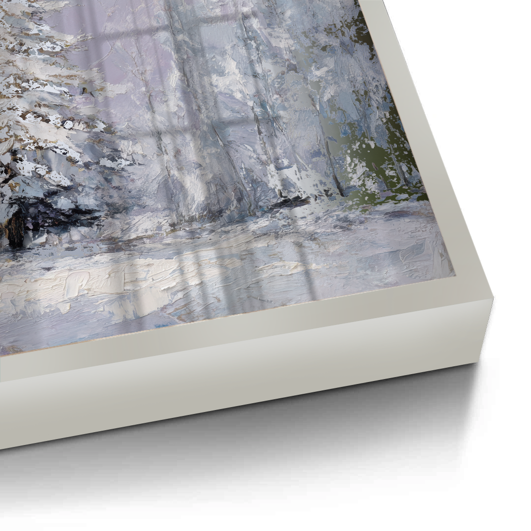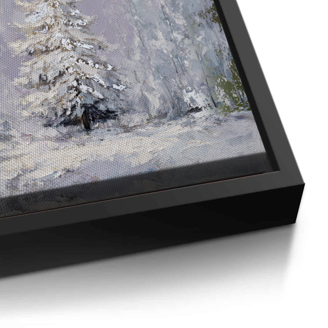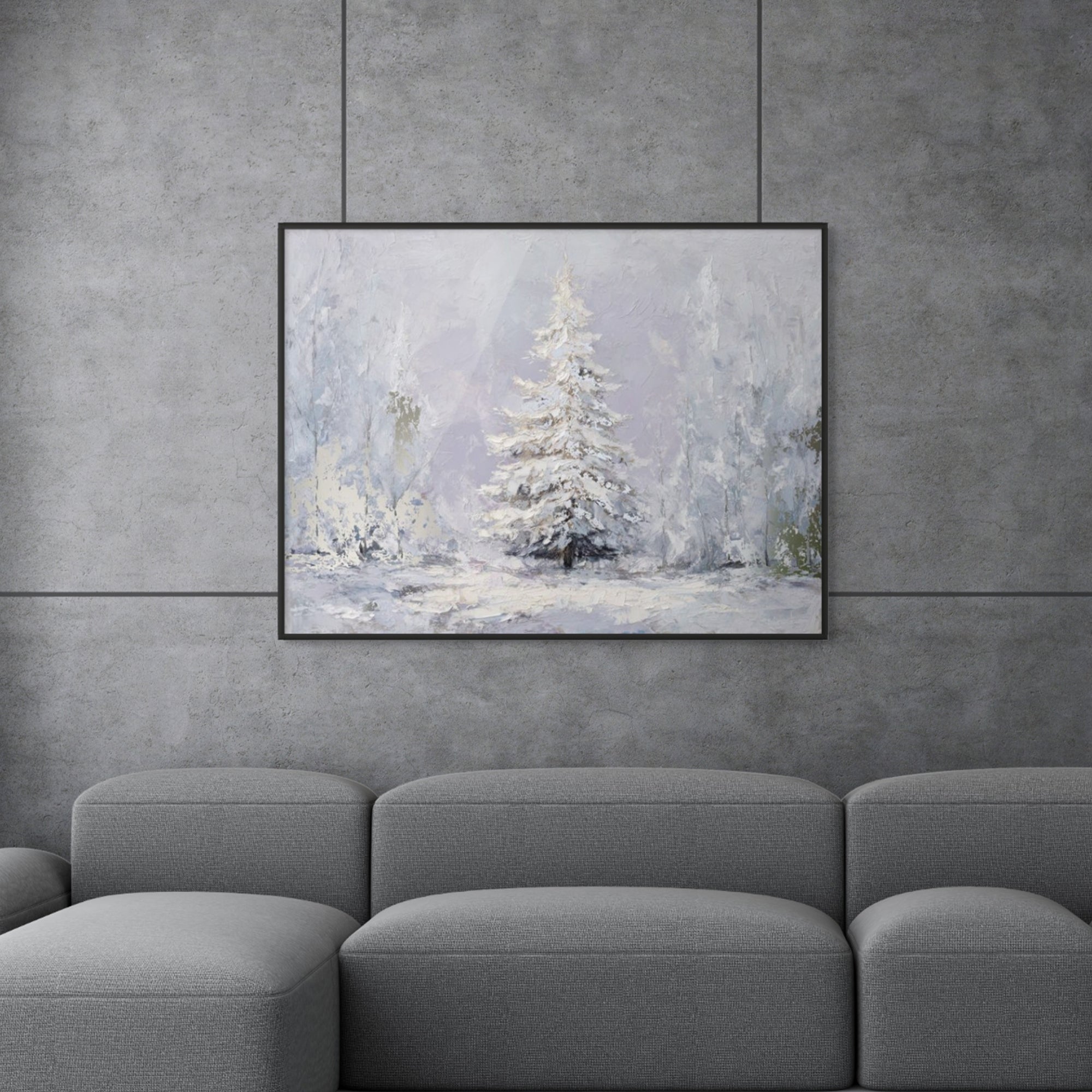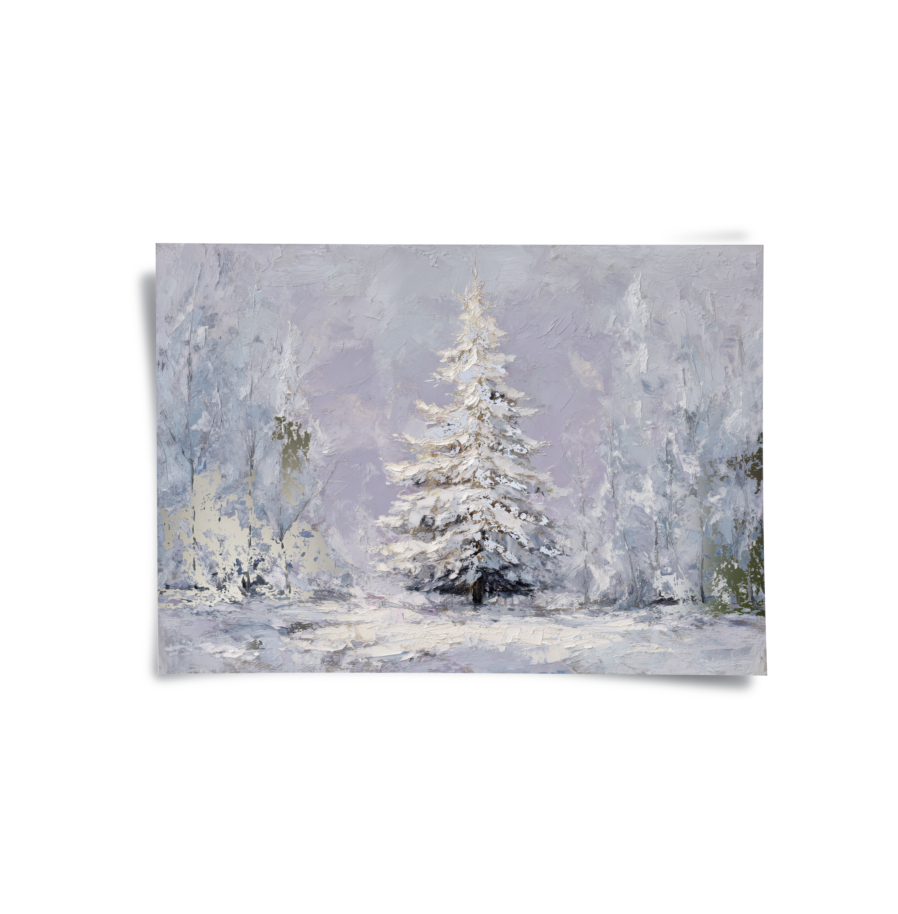 The Last Pine portrays a solitary evergreen standing in quiet snowfall, its snow-laden branches softened by pale winter light and muted tones. The artwork evokes solitude and calm, making it ideal for serene living rooms, peaceful bedrooms, and contemplative hallway or reading spaces.